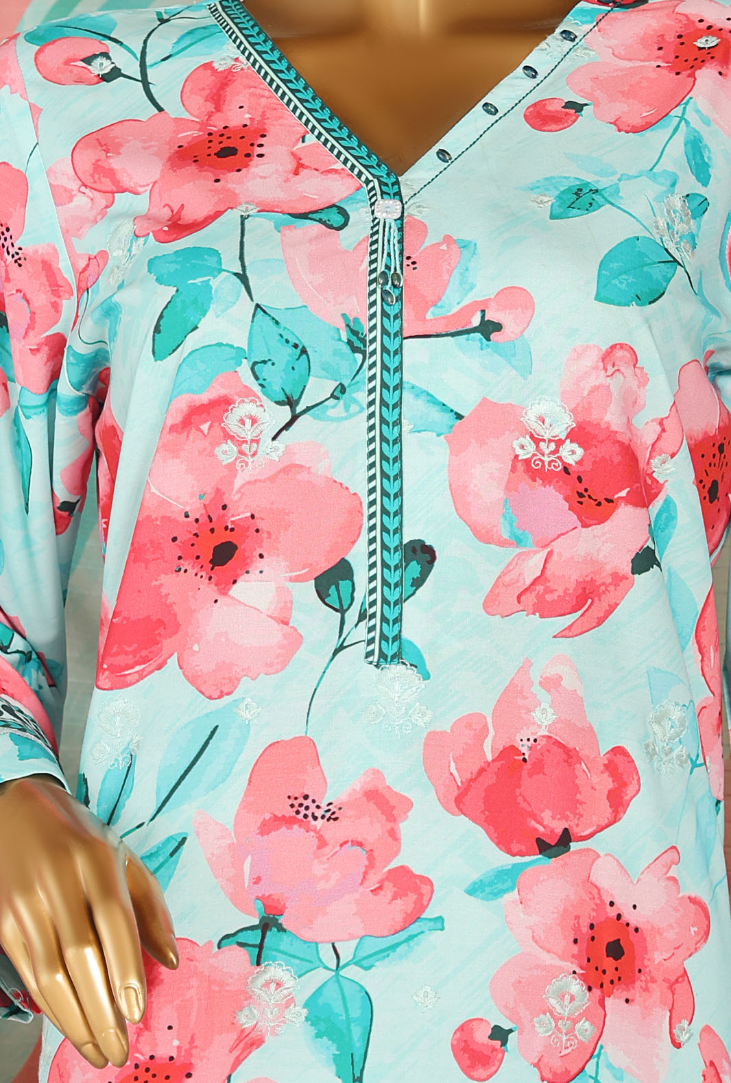Experience the perfect blend of comfort and style with our pure lawn fabric featuring a digital printed fancy diamond karandi/chiffon/check dupatta, adding a touch of vibrant elegance to your wardrobe.