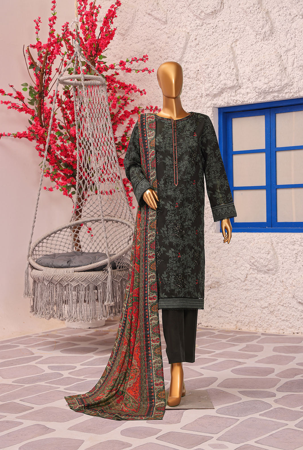 Experience the perfect blend of comfort and style with our pure khaddar fabric featuring a digital printed pure dobby shawl dupatta adding a touch of vibrant elegance to your wardrobe.