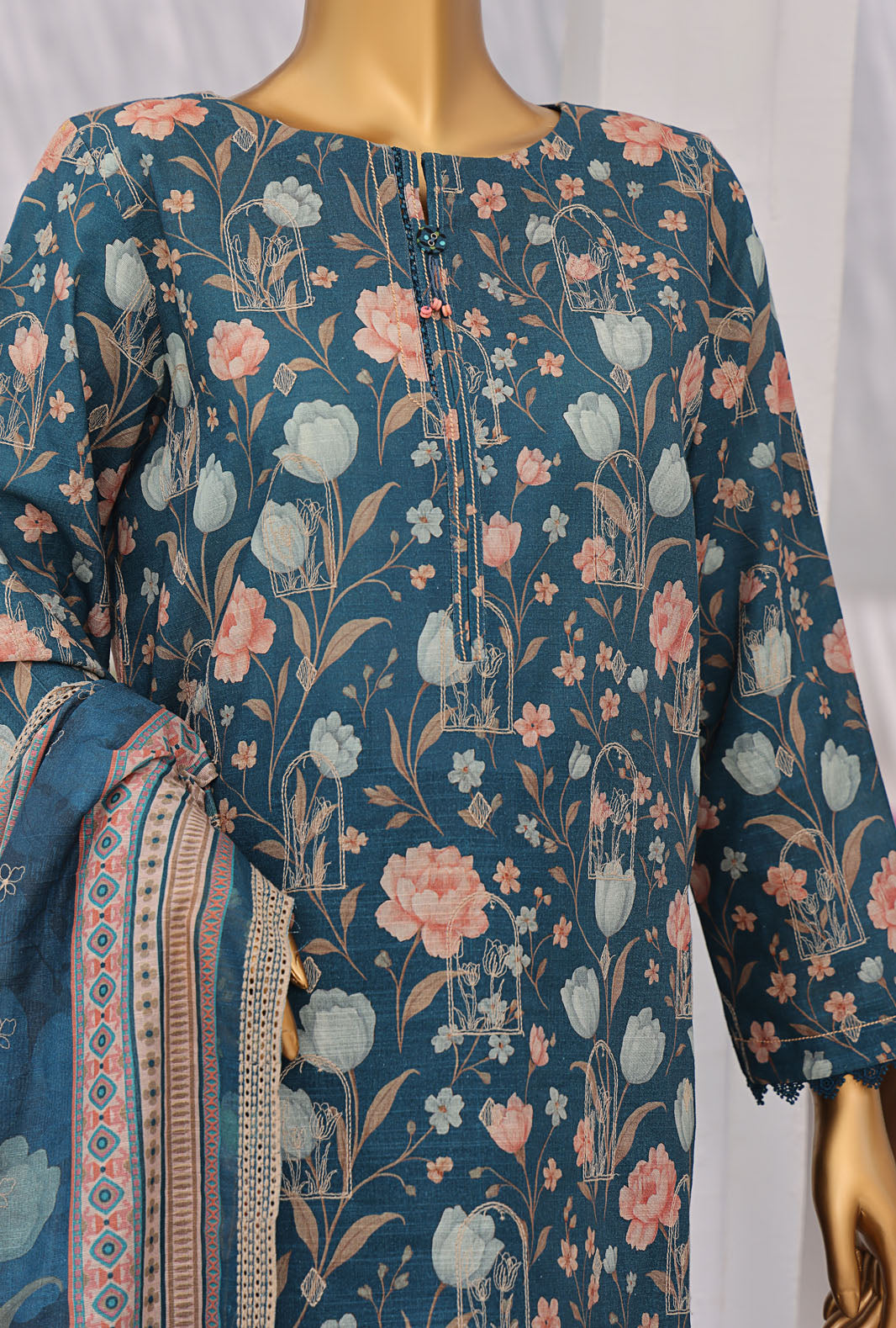 Experience the perfect blend of comfort and style with our pure Khaddar fabric featuring a premium digital printed thread embroidered khaddar dupatta, adding a touch of vibrant elegance to your wardrobe.