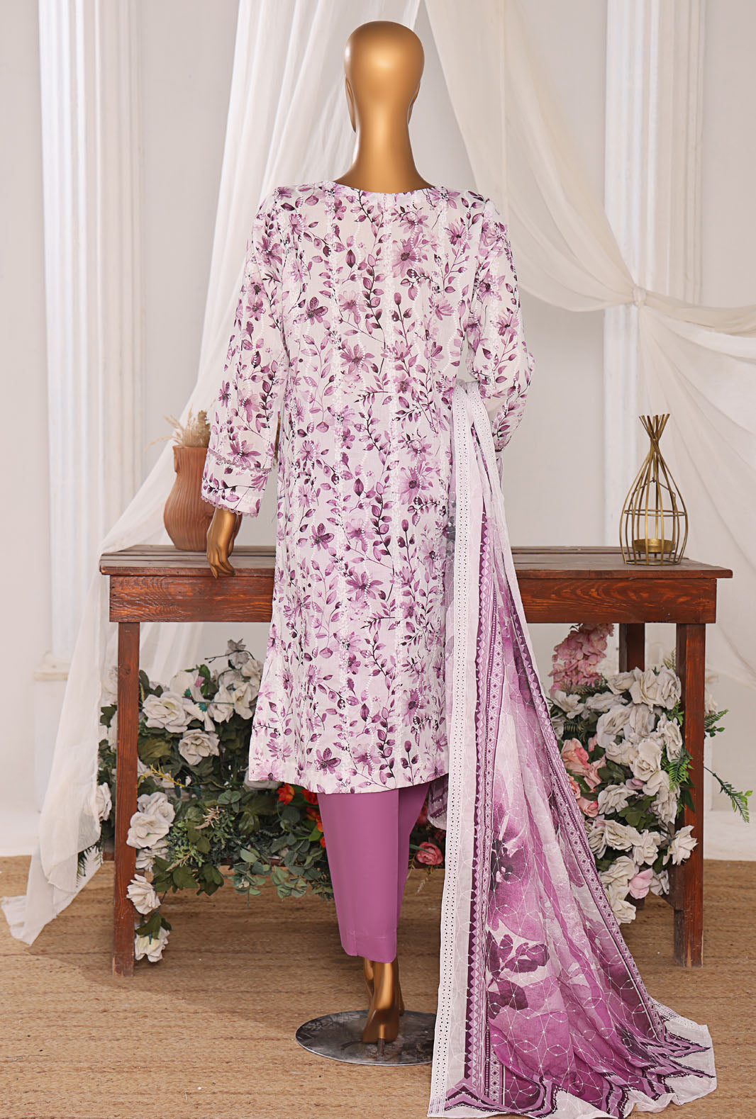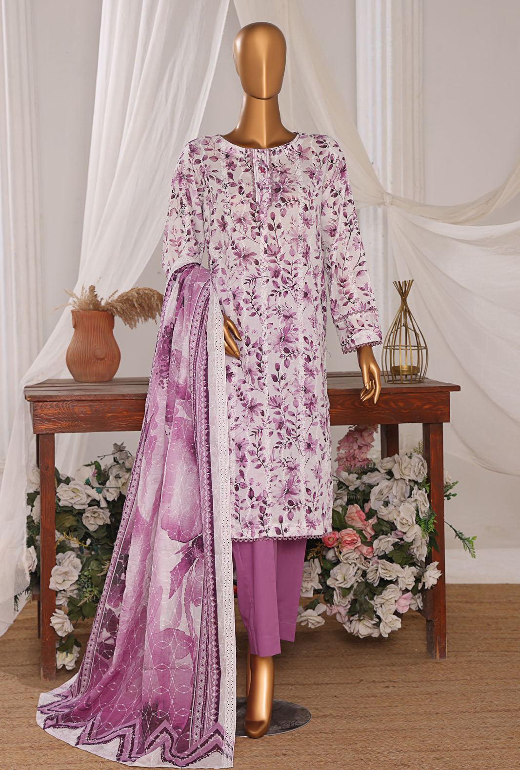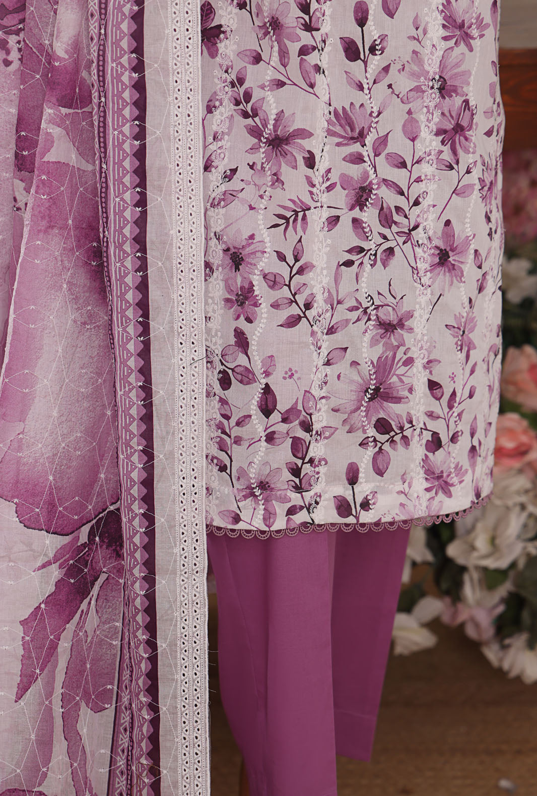 Experience the perfect blend of comfort and style with our pure lawn fabric featuring a digital printed cotton thread embroidered voile lawn dupatta, adding a touch of vibrant elegance to your wardrobe.