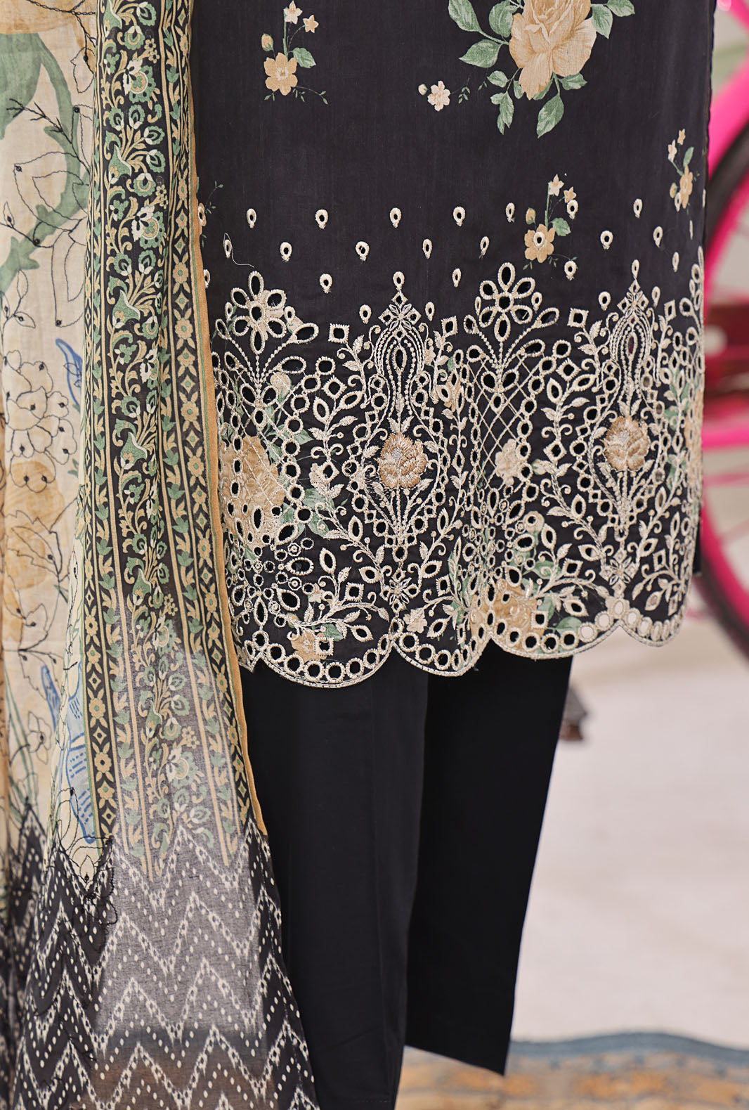 Experience the perfect blend of comfort and style with our pure lawn fabric featuring digital printed embroidered jaal dupatta, adding a touch of vibrant elegance to your wardrobe.