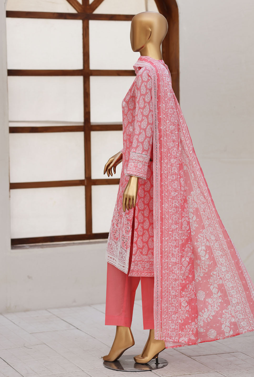 Experience the perfect blend of comfort and style with our pure lawn fabric featuring a digital printed jumpstitch diamond voile dupatta, adding a touch of vibrant elegance to your wardrobe.