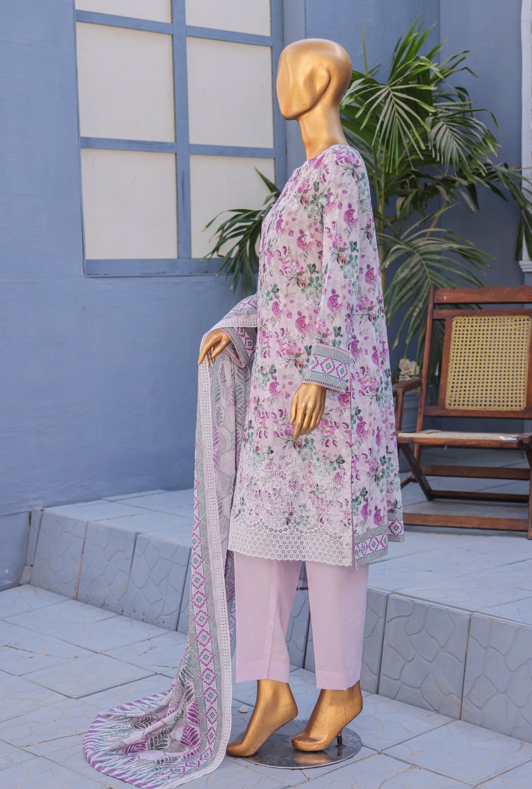 Experience the perfect blend of comfort and style with our pure Lawn fabric featuring a digital printed embroidered cutwork jaal lawn dupatta, adding a touch of vibrant elegance to your wardrobe.