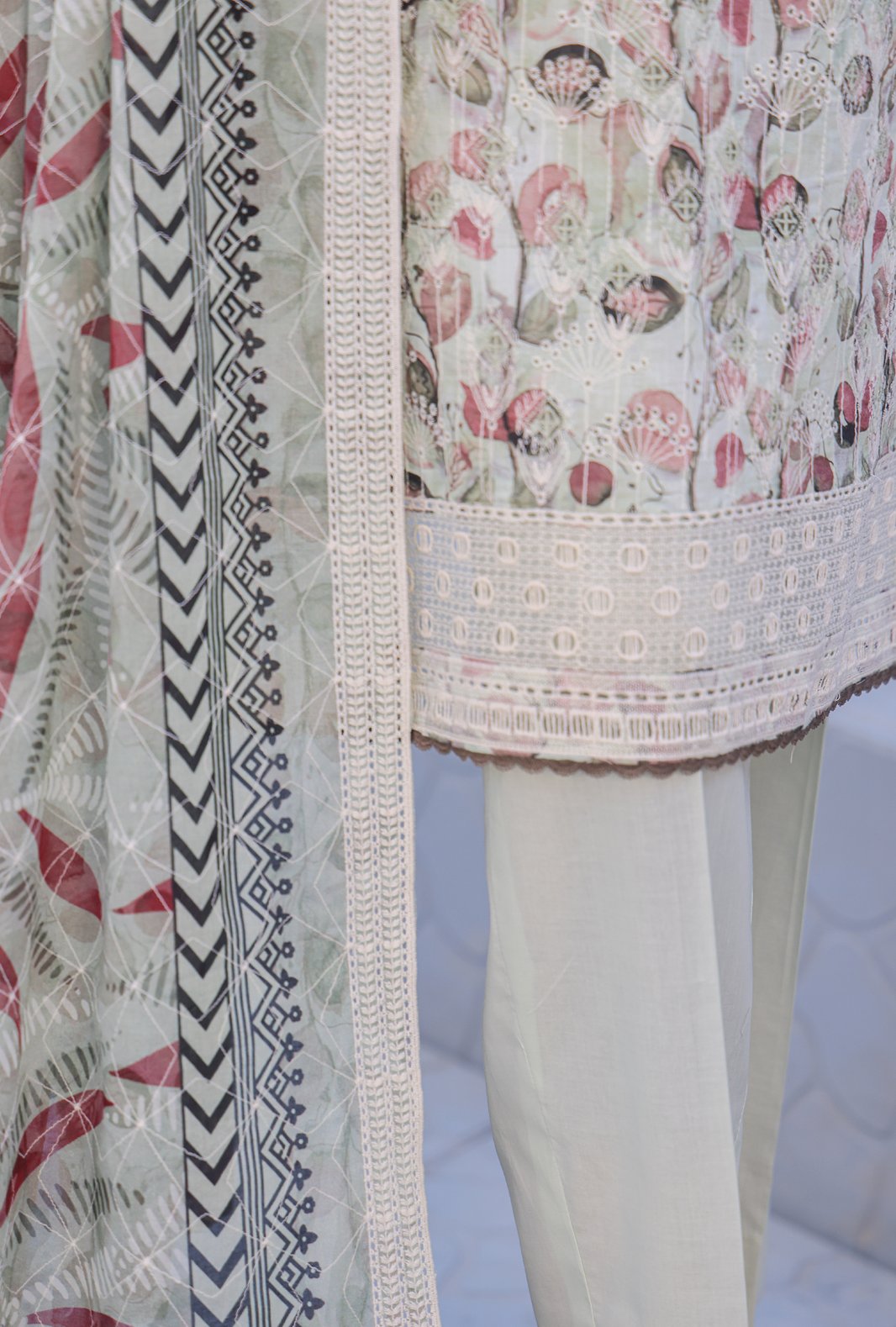 Experience the perfect blend of comfort and style with our pure Lawn fabric featuring a digital printed embroidered cutwork jaal lawn dupatta, adding a touch of vibrant elegance to your wardrobe.